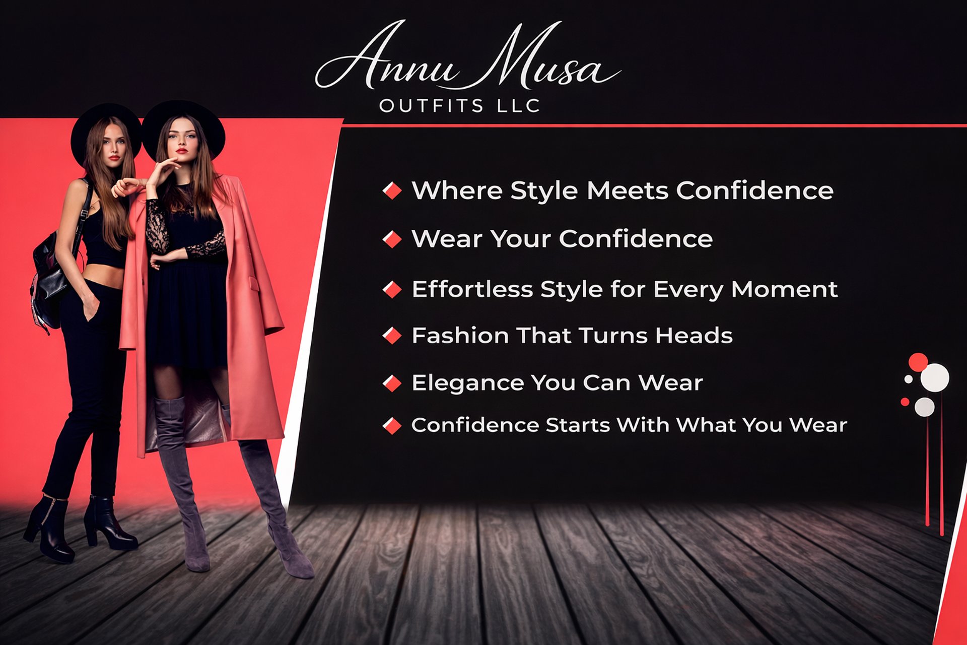 Annu Musa Outfits LLC was created from a love for style, confidence, and self-expression. We believe that what you wear should make you feel comfortable, beautiful, and empowered. Our brand is dedicated to offering carefully selected outfits that blend modern trends with timeless elegance. Every piece is chosen with quality and detail in mind, so our customers can look and feel their best for any occasion. At Annu Musa Outfits LLC, fashion is more than clothingâitâs a statement of who you are.